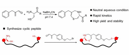Yaqi Wu‡, Cong Li‡, Shihui Fan, Yibing Zhao*, and Chuanliu Wu*, Fast and Selective Reaction of 2-Benzylacrylaldehyde with 1,2-Aminothiol for Stable N-Terminal Cysteine Modification and Peptide Cyclization, Bioconjugate Chem., 2021, 32, 2065–2072.